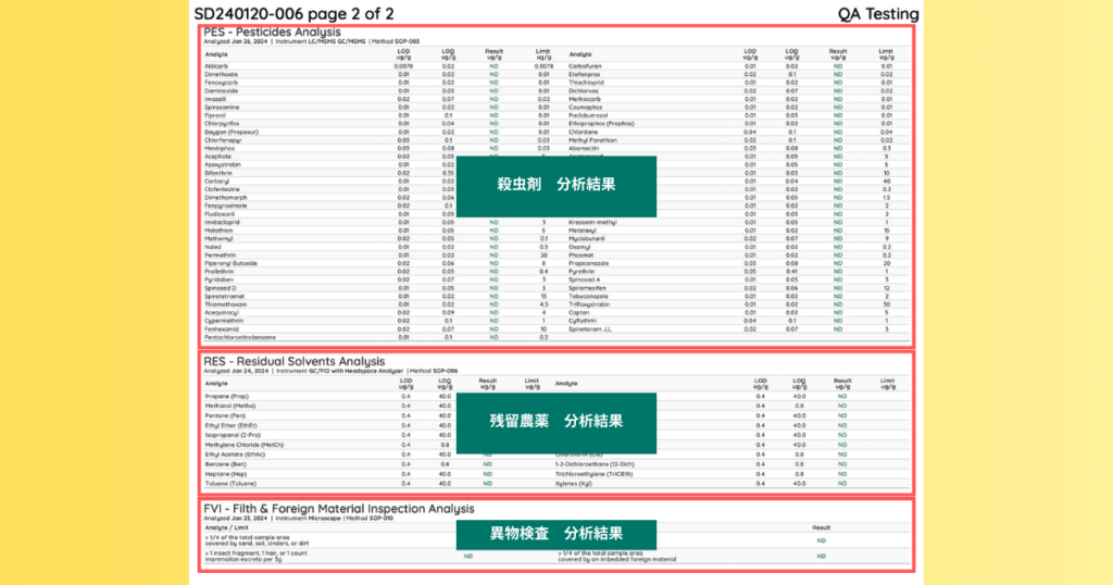 このようにロットごとに検査結果が公開されており、透明性の高さは一目瞭然です。