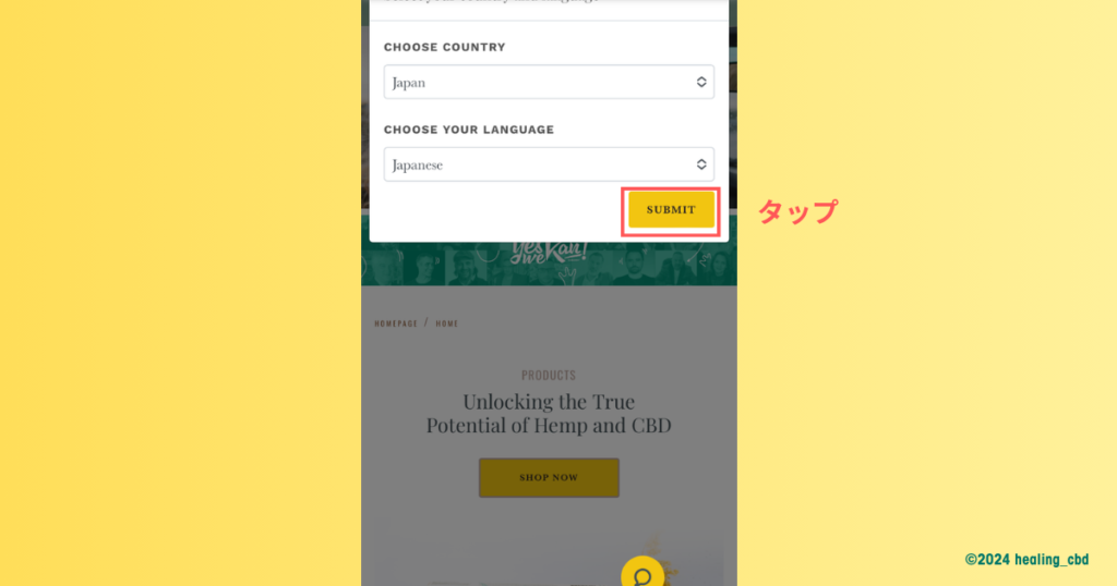 国を「Japan」そして言語を「Japanese」に変更したら、「SUBMIT」のボタンをタップします。