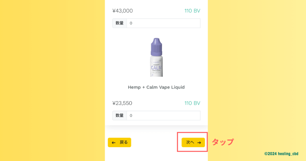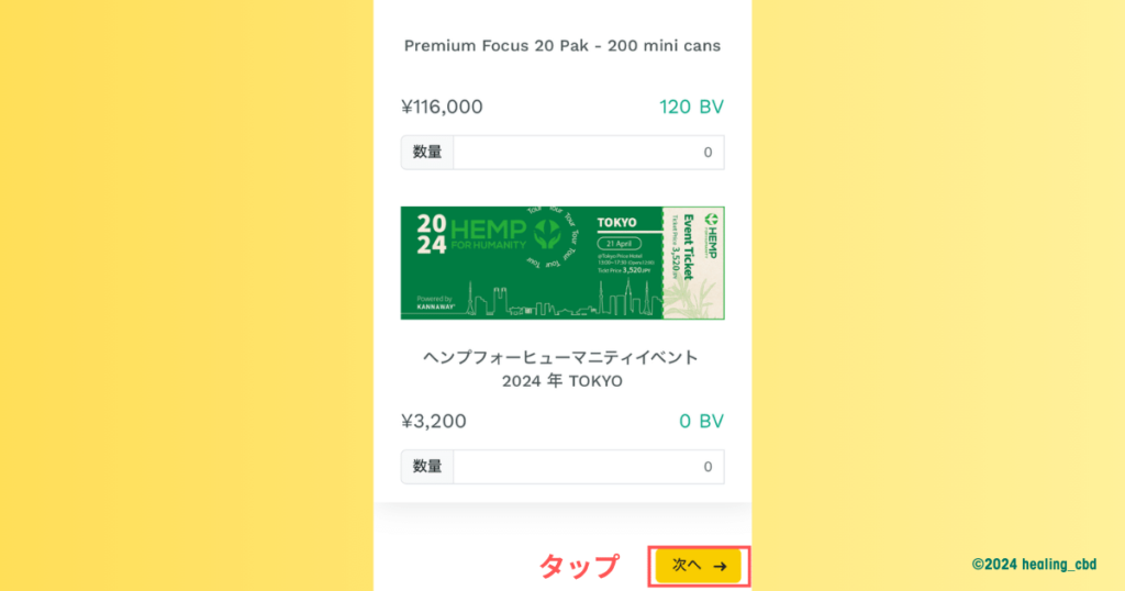 購入する製品全てに数量を入れたら、画面最下部右下の「次へ」のボタンをタップします。