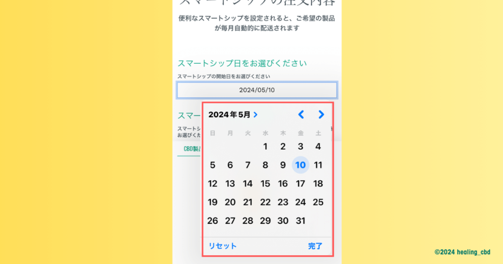 カレンダーが開かれるので、初回の定期購入発送希望日を設定します。