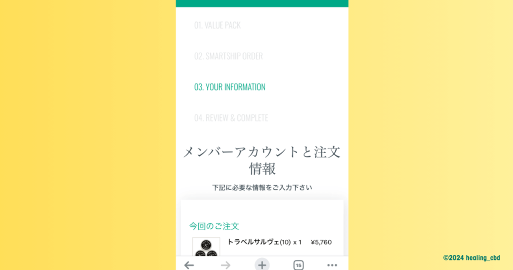 メンバーアカウントと注文情報の画面に遷移したら、必要な情報を入力していきます。