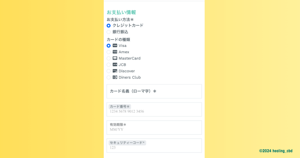 クレジットカード払いを選択する場合、カード情報を入れる必要があります。一方、銀行振込の場合はチェックを入れるだけでOKです。
