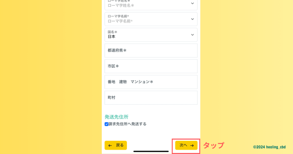 情報の入力が完了したら、画面最下部右側にある「次へ」のボタンをタップします。