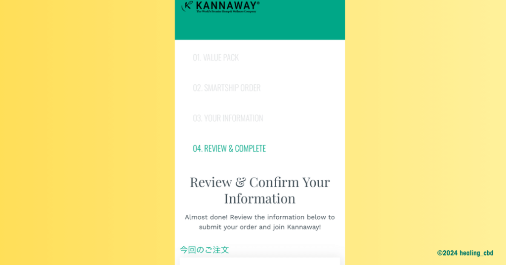 問題がなければ、画面最下部右側の「Pay Now and Join Kannaway」をクリックして注文は完了です。