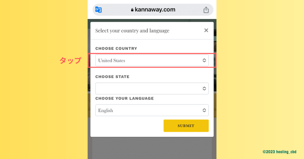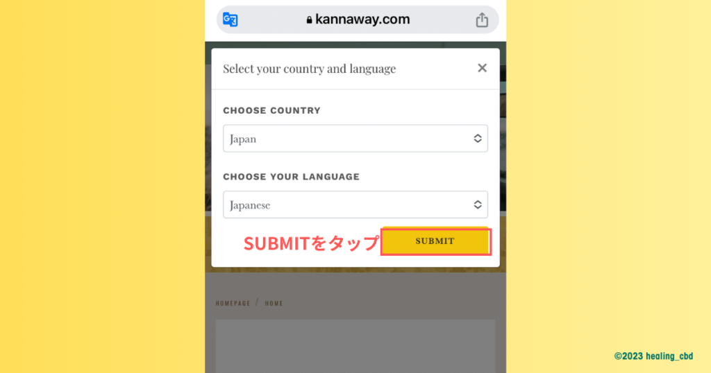 CHOOSE COUNTRYを”Japan”、CHOOSE YOUR LANGUAGEを”Japanese”に変更できたら、”SUBMIT(オレンジ色のボタン)”をタップします。